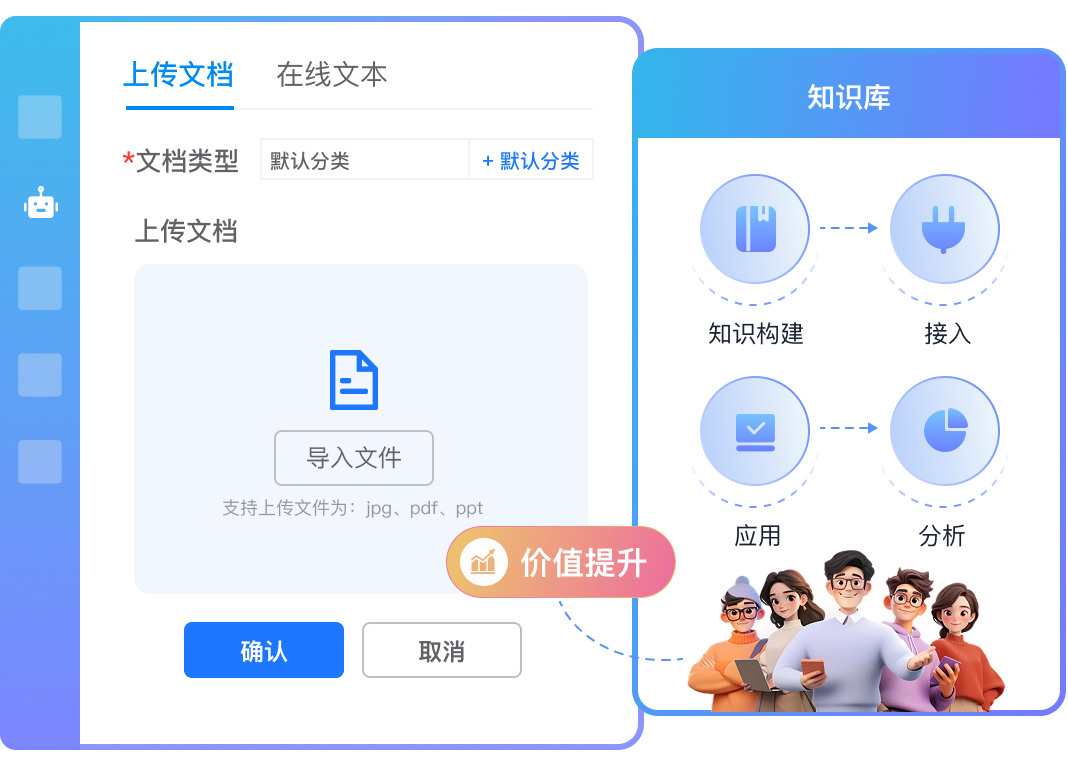 企业原始知识库、文档、会话信息快速上传,自动抽取、聚合、分析,极低的人工介入快速完成知识构建